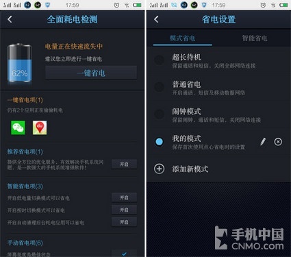 点心省电的功能很强大,主界面一个很大的全面耗电检测按键提示大家首先要检测一下手机的耗电情况,检测过后,原本笔者发现已经关闭的程序原来还在偷偷地耗电,下面的耗电统计也会提示大家相应的软件耗电量。软件还能让用户自己设置省电模式,很是实用。