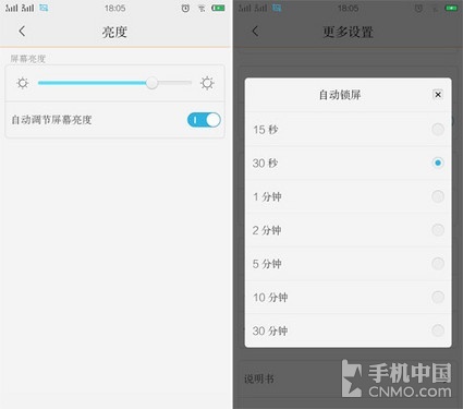 耗电量排名第二的应该就是手机屏幕了,手机屏幕越大耗电量当然越多,对此我们要做的就是调节屏幕的亮度以及调整屏幕超时时间。在设置窗口点击亮 度即可调整(不同手机选项可能不太相同,请以实际为准)。屏幕超时大家最好选择30秒或者1分钟,这样在无操作情况下手机屏幕能尽快关闭以减少电量消耗。