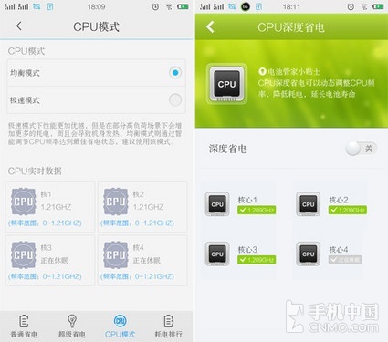 笔者使用的是手机自带的i管家,在省电管理里面有CPU模式可以自行设置,其他手机有优化软件同样有这个功能,比如腾讯手机管家里面的省电管理,同样支持核心CPU省电技术,但是这需要手机具有ROOT权限。