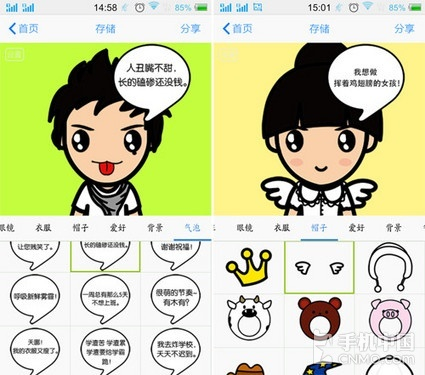 卡通形象制作特别简单,点击屏幕中间的发型脸型眉毛等等就可以出来一系列的图片,只需要左右滑动就可以拼脸了;屏幕的左上角还有一个设置,在这里我们可以还原漫画还可以打开摇一摇功能,摇一摇可以随机制作出一系列的头像。