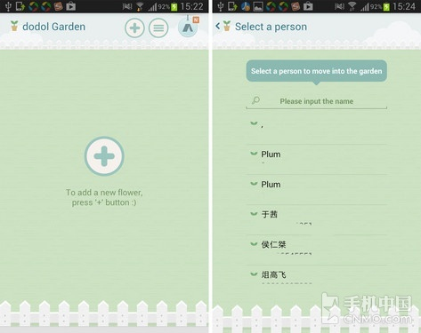 在这款应用中,通讯录中的好友变成了一株株植物,而您就是培育这些植物的园丁。应用的界面就是一大块绿色的草坪,点击中间的加号即可添加联系人信息。