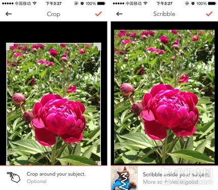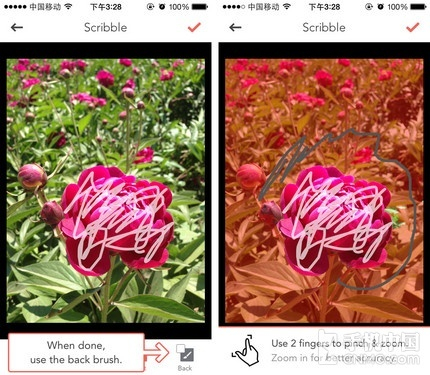 选好照片后的第一步就是用手指涂画出需要留下的部分,当然是涂的越细致越好,不过您不必在意边缘的问题,在接下来的步骤中才会对边缘进行修正。 完成之后就是画出物体的大概轮廓,同样不必沿着边缘,此时要抠除的部分会变成红色。使用两根手指可以放大或缩小图片,如果不小心划出了边界还可以修改。