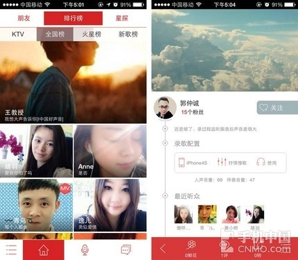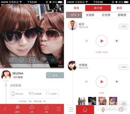 打开应用后首先显示的是排行榜,大海报式的展示方式让普通的演唱者也变成了超级巨星。除了全国榜、新歌榜外,“好唱”还有一个KTV榜单,这又 是什么意思呢?其实这些歌曲可都是在KTV里现场演唱并上传的,只要用户连接KTV的wifi即可使用,这个功能非常适合那些在KTV才能释放自己的用 户,那就把你最好的一面展示给大家吧。