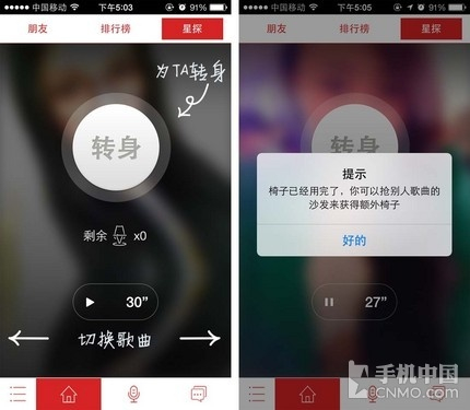 在排行榜旁边还有个“星探”按键,进入之后看到了大大的“转身”二字,这不是中国好声音中的道具吗?原来,用户可以把自己的作品上传到这里,并由网友们试听,如果有人觉得歌声似天籁般美妙即可点击转身,不过转身的椅子可是有限的,下手晚了可就要抢别人的沙发了。