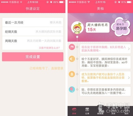 美柚经期助手的界面是清新亮眼的粉色,符合萌妹子们的审美,那几天情绪总是不稳定,一看到这粉嫩的颜色心情也跟着靓丽起来。初次使用要填写一些数据用来快速设定,之后美柚会自动推算出下次姨妈的时间,甚至是排卵期都有提示。