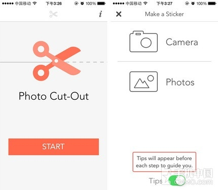 虽然软件是全英文的,不过第一次使用时软件为用户提供了简单的教程,不需要什么英文基础也能看懂。首先要从相册中选择一张需要裁剪的照片,照一张全新的也可以,在界面的最下方有个小提示,如果用户需要指导的话请将“Tips”功能开启。