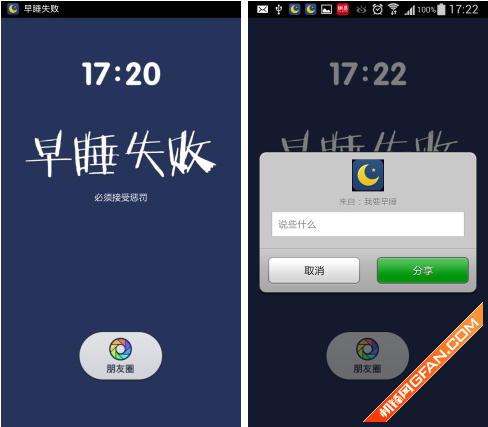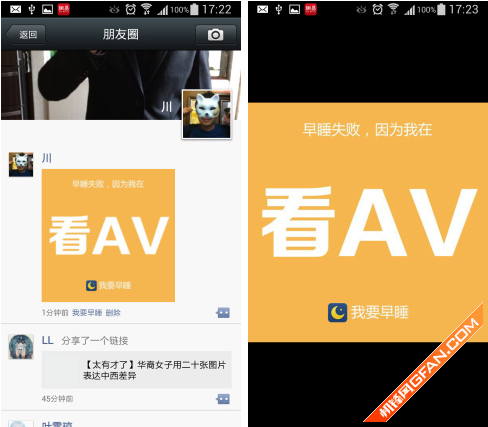 惩罚的措施可是相当严厉的,首先在放弃之后我们是不能对任何软件进行操作的,只要打开软件就会自动跳转到要早睡的界面,除非你通过朋友圈发送一 条消息,但是消息的内容你却不知道,当你发送完毕,再去查看的话,小编就被狠狠的玩了一把,竟然说我们放弃早睡的原因是看AV,这让我在新朋好友面前可真 是无地自容了一回。