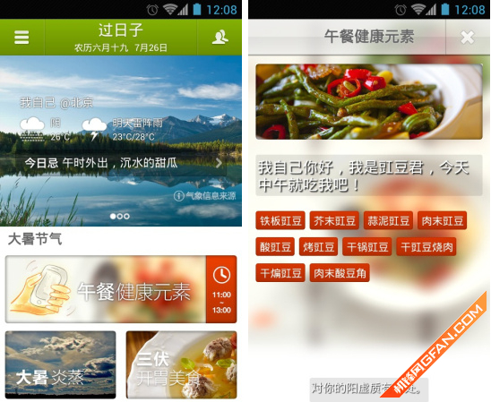本软件并非简单的体质测试软件,也并非简单的美食推荐软件。而是基于医学理论针对你的体质推荐食物,测试结果中的改善建议会让你对自身状况有一 个全面了解,从而杜绝盲目跟风乱吃的情况出现。其实很多人并不喜欢吃垃圾食品,他们只是发愁于不不知道该吃什么好,而偏偏麦当劳又随处可见。过日子首页提 供肉类、蔬菜、水果和饮品类四大健康食材推荐。不仅图片夺人眼球,容易引起食欲,还附上了菜肴的做法。选择困难症?试试看个性化推荐,每一款都是专门针对 你来的。