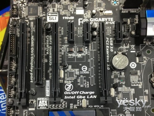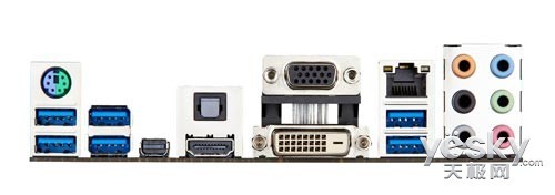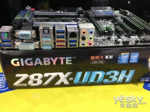 背部I/O端口方面,技嘉Z87X-UD3H提供1个PS/2键盘/鼠标插座;1个D-Sub插座;1个DVI-D插座;1个HDMI插座;1 个DisplayPort插座;1个S/PDIF光纤输出插座;6个USB 3.0/2.0端口;2个eSATA 6Gb/s插座;1个RJ-45埠;6个音源接头(中央及重低音输出/后喇叭输出/侧喇叭输出/音源输入/音源输出/麦克风)。完全满足极致超频玩家和游 戏发烧友的需求。