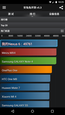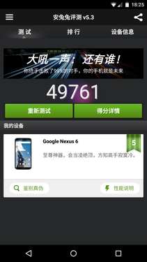 通过安兔兔跑分软件可以看到,Nexus 6的综合跑分成绩位列榜首,魅族MX4和同样采用了骁龙805处理器的三星Note4紧随其后。当然跑分仅仅是硬件性能的参考,仍有很多其他方面因素制约着产品性能的发挥。