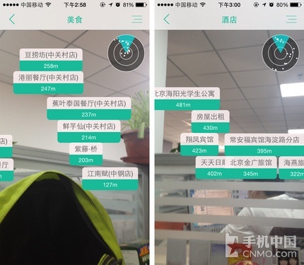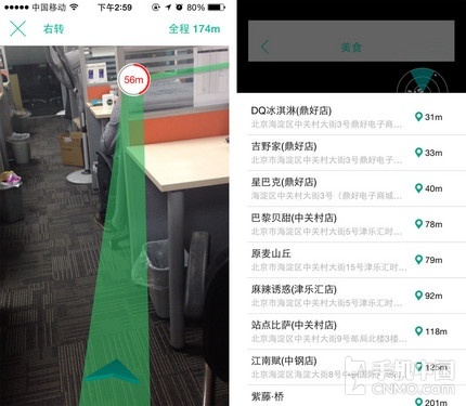 进入寻找美食功能,应用将会请求开启摄像头,接着将手机举起环顾四周,屏幕上将会出现您正在寻找的目标,且界面中还有箭头为您指引,这么贴心的设计肯定不会走丢。确定好目的地之后点击箭头,应用将自动生成路径,即使在陌生的城市也能顺利到达。若您觉得举着手机来回转太麻烦,点击右上方的菜单,所有周边美食信息一次性展示,想去哪个听您的。