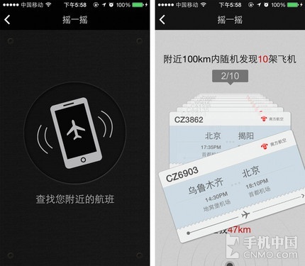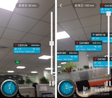 如果光是这点小技能,《百度天眼》还算不上是震撼,它独有的“嗅探”和“摇一摇”更为有趣。进入“嗅探”界面,应用将自动搜寻距您50公里内的所有航班,但与之前在地图上显示不同,用户需要将摄像头对准天空的任意方向,这些在头顶的飞机就会一一出现在屏幕上了。