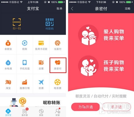 更新后在主界面的右侧即可发现亲密付的字样,点击进入后应用为用户提供了两种方式,一是为别人开通,二是请别人为您开通。