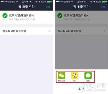 开通之后别忘记告诉另一半,怎么说也算是提前发了一个月的零花钱,怎么能就这么算了呢?要大张旗鼓的分享出来!钱包君提供了三种分享方式,微信、来往以及短信,这可比送礼物来的实惠多了。