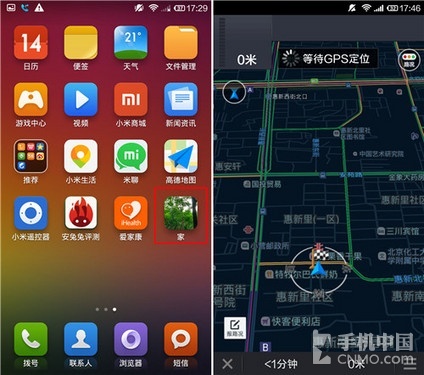 此次笔者使用的是搭载MIUI V5系统的小米4,该机采用了5英寸屏超窄边,搭载骁龙801处理器、3GB内存、前置800万、后置1300万像素索尼相机。为了提升制造工艺还首次采用不锈钢金属边框,拥有不错的手感。系统方面,虽然MIUI 6已经推出,但为了测试兼容性,笔者并没有选择升级。从配置来看笔者认为该机运行高德地图是没有问题的,但是高德地图在这款手机上的表现到底如何呢?