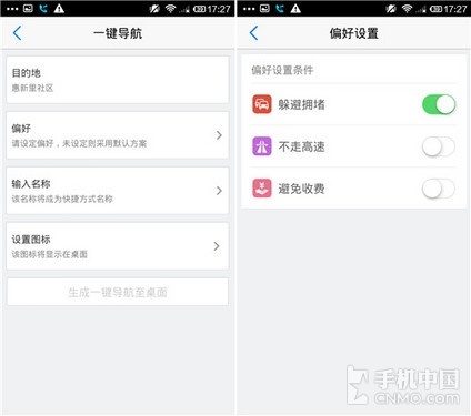 待一切就绪,就让我们来说说今天的内容“桌面一键导航”。进入该功能后,我们要设置一个常用的目的地,当然还可以选择偏好,比如躲避拥堵、不走高速、避免收费。之后要为一键导航设置一个名词,这里我们就可以自行输入了。我们还可以设置图标,大家可以实时拍照也可以从相册中选择。都设置成功之后我们就可以点击生成一键导航至桌面了。这时大家在桌面上就会看到刚才我们所设置的目的地了。