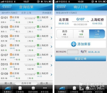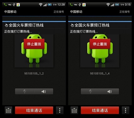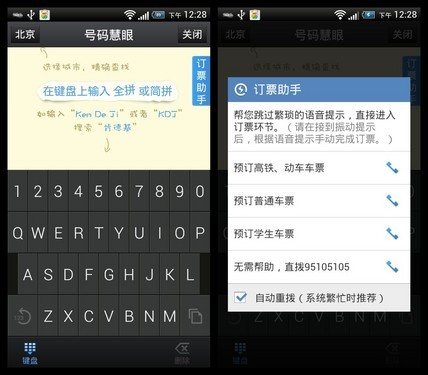 其次,的票助手对不同类型的车次,进行了分类,用户无需收听沉长的语音提示即可进入相应的订票分类当中;另外自动重播功能可以再订票高峰期先人一步打进电话,而遇到无法打通时的自动重拨功能,省去了重复拨打电话的繁琐操作。