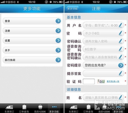 打开“铁路12306”App,进入后先点右下角的“更多功能”→“登录”,使用12306.cn的用户名和密码登录。没有账号的朋友,可以在此应用里注册,或者进入到12306.cn进行注册。