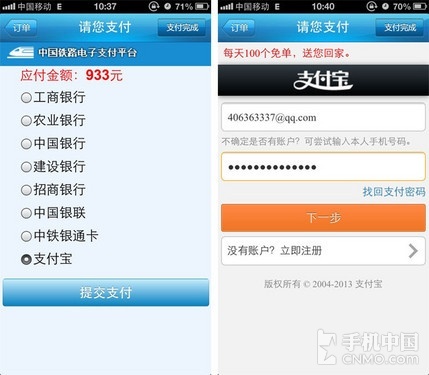 订单可以使用工商银行、中国银行、建设银行等手机银行支付,现在还支持支付宝付款。输入支付宝账号和支付密码即可付款,使用支付宝成功付款一次后,支付宝账户可以自动保存,下次买票就不用再重复登录支付,直接选择账户付款即可。