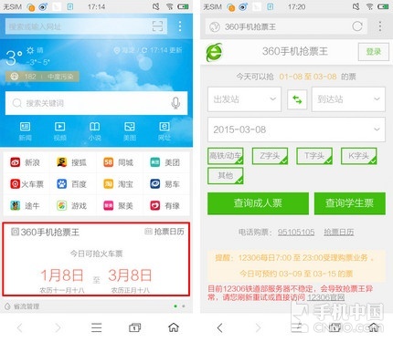 360手机浏览器也是一款支持抢票服务的应用,在首页的显著位置您就可以发现抢票入口,由于今年的火车票预售期提前了很多,为了方便用户查询,360手机浏览器还特别标注出了对应的抢票日期,您可千万别买错了。