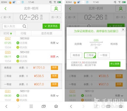 每隔5秒钟,360浏览器就会刷新一次,直到成功找到票源为止,只不过为了保证刷票成功,用户需要停留在当前页面中,无法进行其它操作还是多少有些不便的。