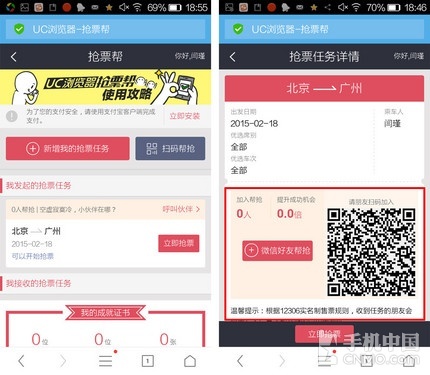 临近买票的那段时间,办公室里最常见的对话就是:能帮我买张票么?但是只靠自己的力量刷票稍显单薄,UC浏览器拥有“抢票帮”功能,发动身边的一切力量帮助您早日回到温暖的家中。
