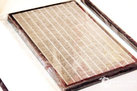 接下来则是活性碳滤网加HEPA滤网的复合式滤网,可以过滤0.3微米颗粒物,并且实现99.9%的高效化率。