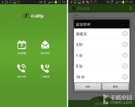 软件共有四种功能:来电提醒、虚拟简讯、虚拟来电、一键逃脱,咱们就先从最实用的虚拟来电开始试用。虚拟来电的设置非常简单,但在关键时刻却能派上大用场。首先您需要设定来电时间,最短3秒钟后最长10分钟后,要是都不合适就自定义一个时间,这种方式更灵活更好掌握时机。联络人既可以从通讯录里选择也可以自己设置一个人名,还能提前录好通话内容,简直可以以假乱真,一般人绝对看不出破绽。