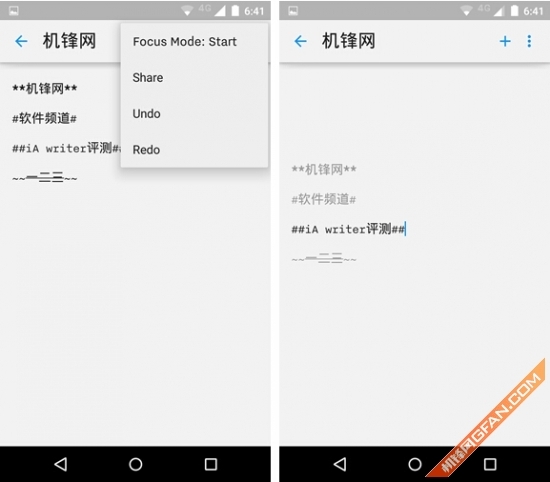 除了基本的文字编辑和Markdown功能外,《iA Writer》还具备“Focus Mode”功能,打开这个功能后,编辑器会根据你的光标进行聚焦式显示,也就是只把光标所处位置的段落用正常模式显示,而其他部分则进行淡化效果处理,这样可以让用户在编辑文本时更加专注,也可以降低眼睛的疲劳程度。