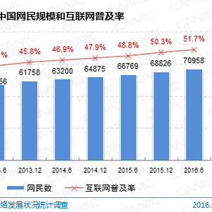 1、网民总规模:中国网民规模达7.10亿,半年共计新增网民2132万人。互联网普及率为51.7%,较2015年底提升了1.3个百分点。