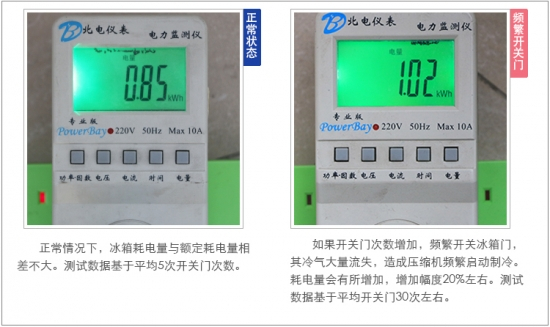 在增加冰箱开关门次数后,频繁开关门势必会让冷气大量流失,并且造成压缩机频繁启动,这时候耗电量就会有所增加。上图中,一款冰箱正常状态下耗电量在0.85度,而增加开关门次数后,耗电量为1.02度。这说明频繁开关门对耗电量会有影响,影响幅度在20%左右,这和使用频率有很大关系。