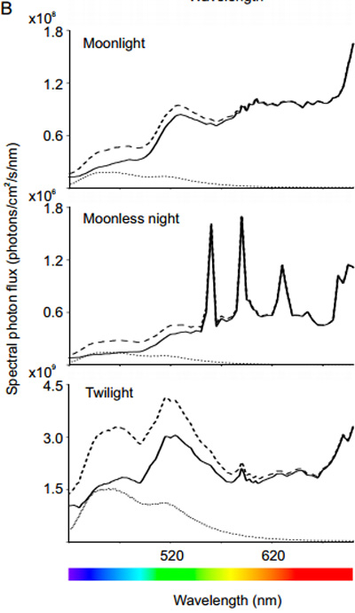 Faivovich和同事们在青蛙的淋巴和皮肤腺中找到了荧光成分。它吸收短波长、高能量的光,转化成长波长、低能量的光放射出去。不仅如此,这种成分还能操控荧光的亮度:满月时青蛙的亮度增加19%,新月时青蛙的亮度增加30%。