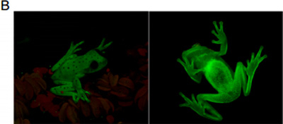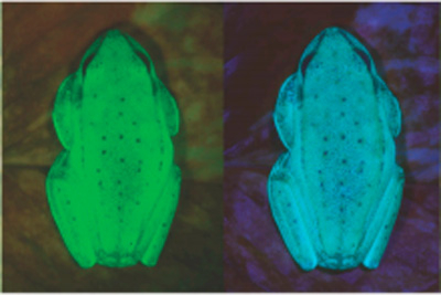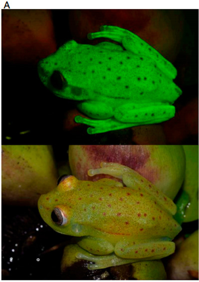 荧光的陆生和水生动物并不罕见。很多种鱼和一小部分海龟、鹦鹉等动物都是荧光动物。然而,在7600多种两栖动物中,圆点纹树蛙是至今人们发现的第一种荧光动物。