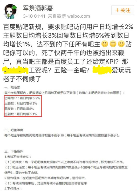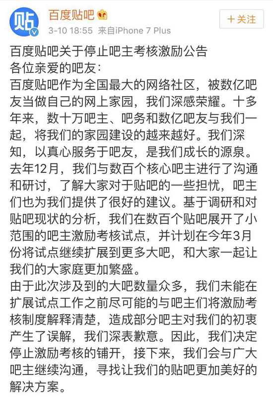 百度贴吧在3月10日晚间发布紧急公告,称将停止吧主考核激励,接下来会和广大吧主继续沟通,寻找解决方案。