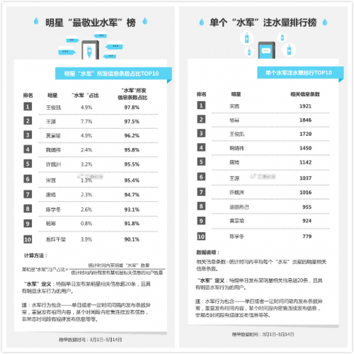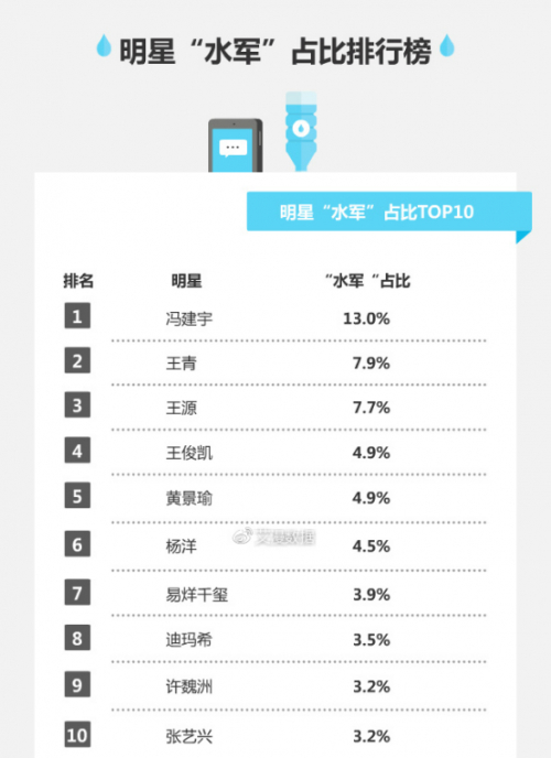 在艾漫数据的报告中,“水军”被认定为“单日发布某明星相关信息超过20条的用户”。通过后台监测,艾漫统计了“水军”占比最高的前十位明星,其中第一名的“水军”占比已经超过了总量的十分之一。