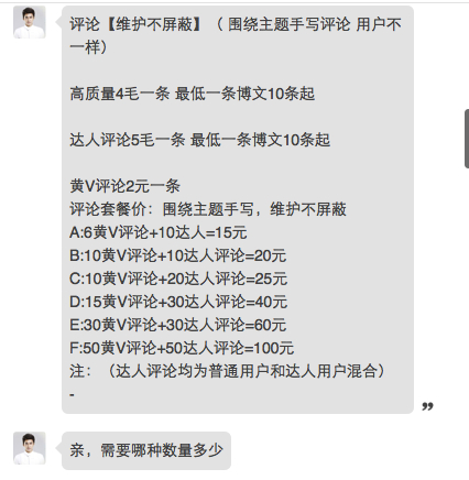 据了解,水军发一条评论的价格一般在0.2到0.5元之间。淘宝的一位商家表示,高质量的评论4毛一条,达人评论5毛一条,黄V评论2元一条。店家负责维护水军评论不被发布平台屏蔽。