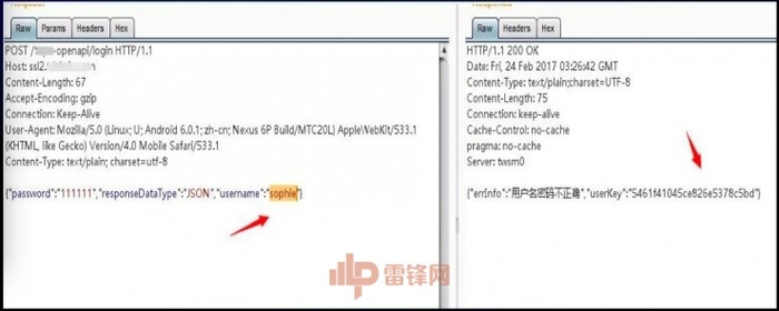 这是WEB系统的密码找回最后一步的流程,整个流程在找回输入注册时候预留的邮箱,系统会将密码找回的链接,输入了密码以后抓包,就可以来到这一步,正常而言,KEY 的参数应该是随机生成的,但当时测试几次后发现KEY是不变的,那么 KEY 会不会是和用户身份相关的标识呢?能够从系统中找到用户的ID和KEY的对应关系,就可以重置任意一个用户的密码,但是我在整个系统中都没有找到相关踪迹,这时我把眼光投向了移动 APP ,果不其然,我在移动 APP 登录请求发现了一些蛛丝马迹,经过比对和之前密码找回的 KEY是一样的,把这两个请求组合起来就能做到——知道用户名就可重置任意用户的密码了!