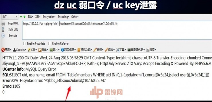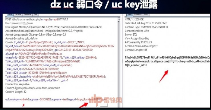 如果仔细看过漏洞详情,就会知道 UC 有很多的 API 设计非常不安全,利用 API 爆破 UC 创始人的密码,这个爆破不受验证码请求次数的研制,爆破创始人密码可以登录 UC 的后台,相当于可以获得论坛至高无上的权限,我在众测过程中发现很多厂商对这里有一些加固,可能会做访问的限制,比如,针对源 IP 的限制,出现这种情况可以回到这里,在拿到创始人密码情况下,可以获得论坛对应的 uc key,可以结合之前UC 的漏洞进行选项,还可以进行注入,注入写本地的中转脚本,可以利用自动化工具完成。