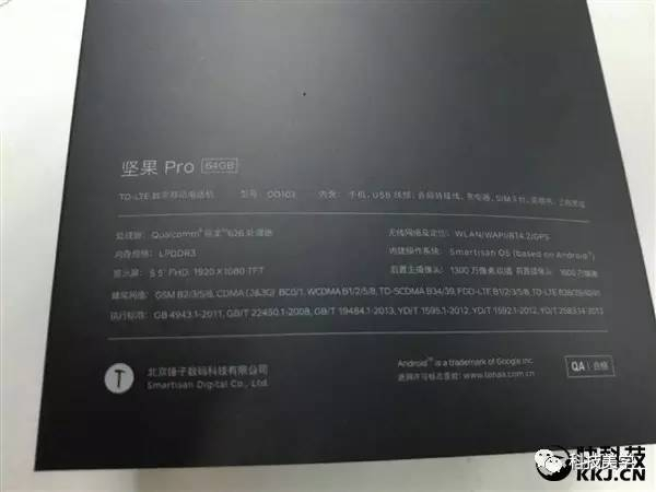 而一张包装图谍照展示了坚果Pro的完整配置:型号OD103、5.5寸1080p TFT屏幕、高通骁龙626处理器、LPDDR3内存(没说容量)、64GB存储、1300万像素后置双摄像头、1600万像素前置摄像头。