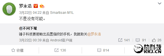 有趣的是,有网友在微博上提出锤子科技要胆敢出后置指纹的手机,就取关罗永浩,结果老罗来了一句:“不是没有可能。”