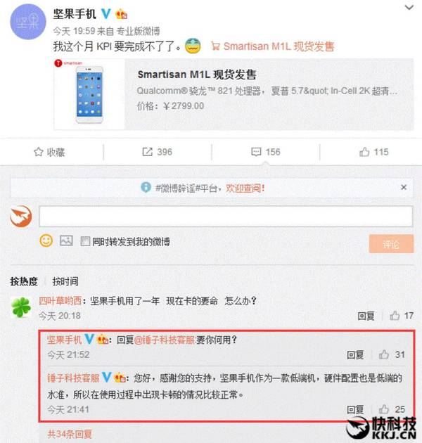 @锤子科技客服 很快就做出了解答,但答复实在让人喷饭:“您好,感谢您的支持,坚果手机作为一款低端机,硬件配置也是低端的水准,所以在使用过程中出现卡顿的情况比较正常。”