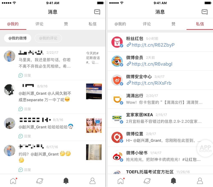 底部第三个按钮就是消息盒子了,展示了@、评论、赞和私信,并且优先展开显示@及评论消息,将蓝 V 认证的广播推送消息都收到了「私信」标签下。在屏幕上左右滑动即可切换查看不同类型的通知。