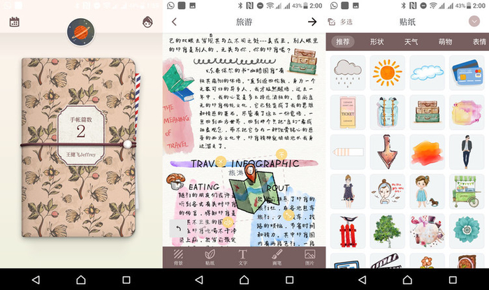 在操作上,这款App可以说是一个复杂版的美图秀秀里的“自由拼图”,它将手帐上丰富的元素分为背景、贴纸、文字、画笔和图片五个分类,在每个分类下都提供了上千种素材,将一个素材帖到手帐上之后还可以对大小、角度进行调整,素材之间可以相互叠加产生出全新的效果,既不用像实体手帐那样担心一个手误毁掉一页纸,也不用担心制作出来的手帐与别人撞脸。