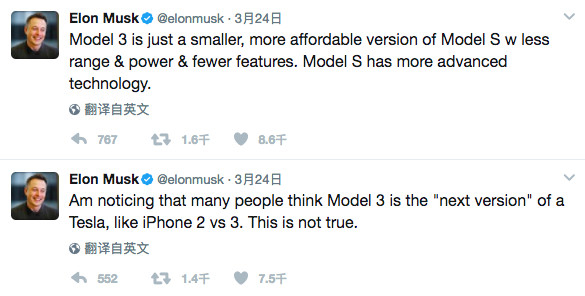 接着他又在下一条推文上表示,Model 3是一款比Model S体积更小、更经济实惠的车型,其拥有比较短的续航里程、更小的输出功出以及更少的功能。而Model S搭载了更多先进技术。