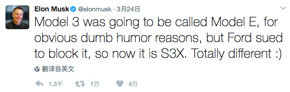 为此,Musk称,现在特斯拉的产品线就变成:S3X(原为SEX,根据特斯拉Model S,Model 3,Model X的后一个字母组成)。