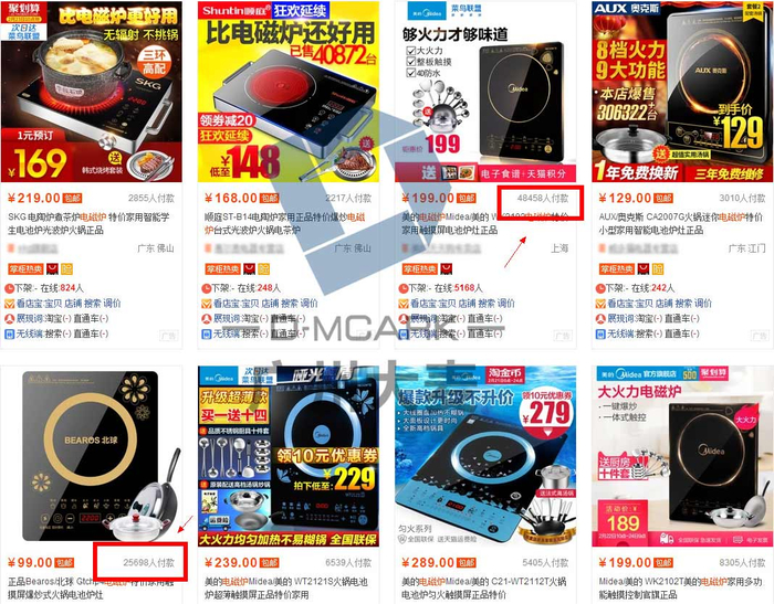 最近,我想买一款电磁炉,于是我去淘宝搜索一下电磁炉,然后看到一堆眼花缭乱的主图,那么问题来了,这么多的店铺,消费者会怎么选择呢?显然,如上图所示,两个白底比较干净的主图销量最好,其他主图虽然无论是效果上还是利益点,都不差于这两张,可惜他们都千篇一律,从而在这里,越是干净的背景,越是有醒目突出的效果!相反,在一堆没什么效果简单的主图中,做一张富有设计感的主图,往往是决胜的关键!
