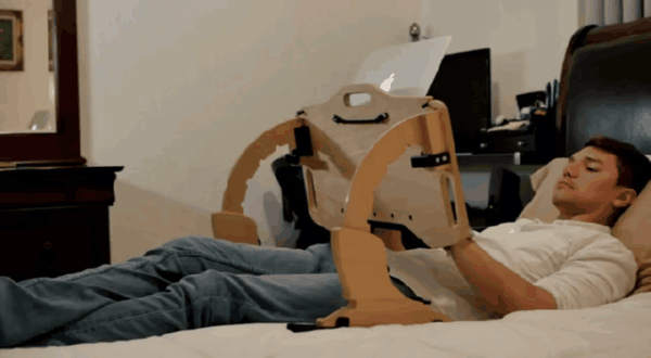 将AdapDesk打开,在床上可以轻松使用,由于灵活的角度调节,躺着、坐着都能用,硕大的桌脚也能提供稳定的支撑效果。