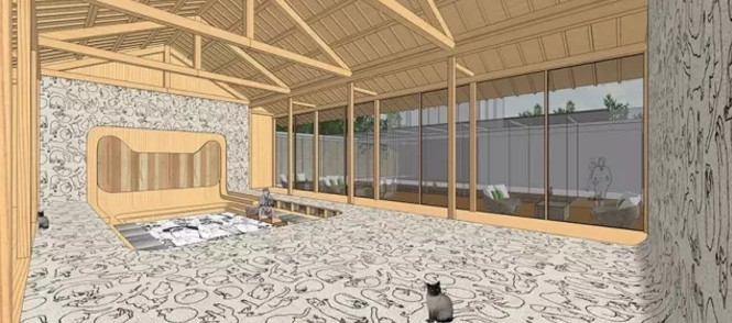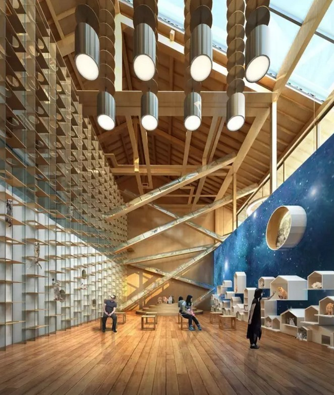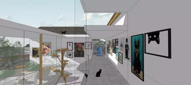 整个猫主题艺术展区通过玻璃空间相隔,室外是一百多个猫小窝可供猫咪跳跃嬉戏,室内是一个开放空间,可供各种主题布展。
