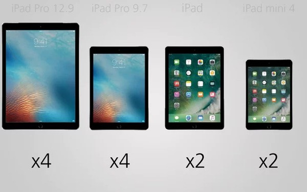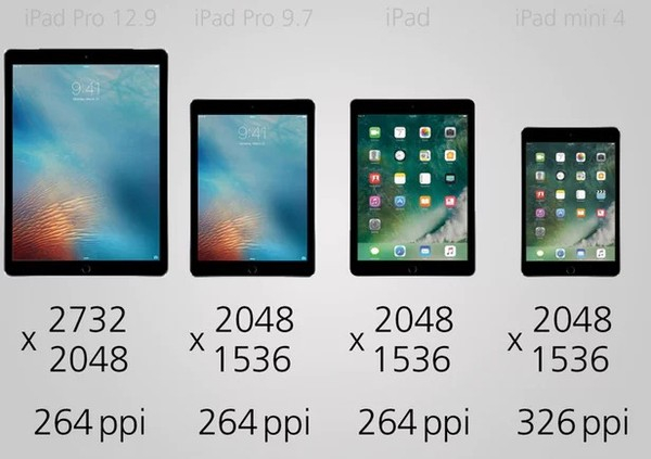 iPad Pro 12.9的屏幕为12.9英寸,iPad Pro 9.7和iPad (2017)都为9.7英寸,iPad mini 4为7.9英寸,iPad Pro 12.9的显示效果要比iPad mini 4大77%。